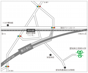 愛知環状鉄道「八草」駅下車、東部丘陵線(リニモ)に 乗り換え「芸大通」駅下車 徒歩約10分